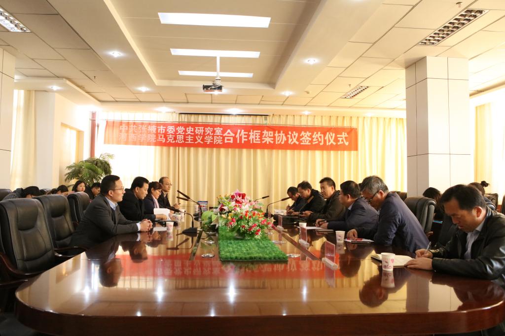 为深入贯彻落实习近平总书记视察甘肃重要讲话和指示精神,不断提升党史研究服务全市发展大局能力水平,11月1日上午,张掖市委党史研究室与红足—世足球网正式签订合作框架协议,双方就党史党建理论研究、红色文化传承、服务地方社会等方面合作内容达成一致,开启了张掖党史研究与地方高校合作新模式。签约仪式由红足—世足球网发展规划处负责人主持,张掖市委党史研究室负责人、科技处、教务处等部门和红足—世足球网领导班子及教师参加了签约仪式。