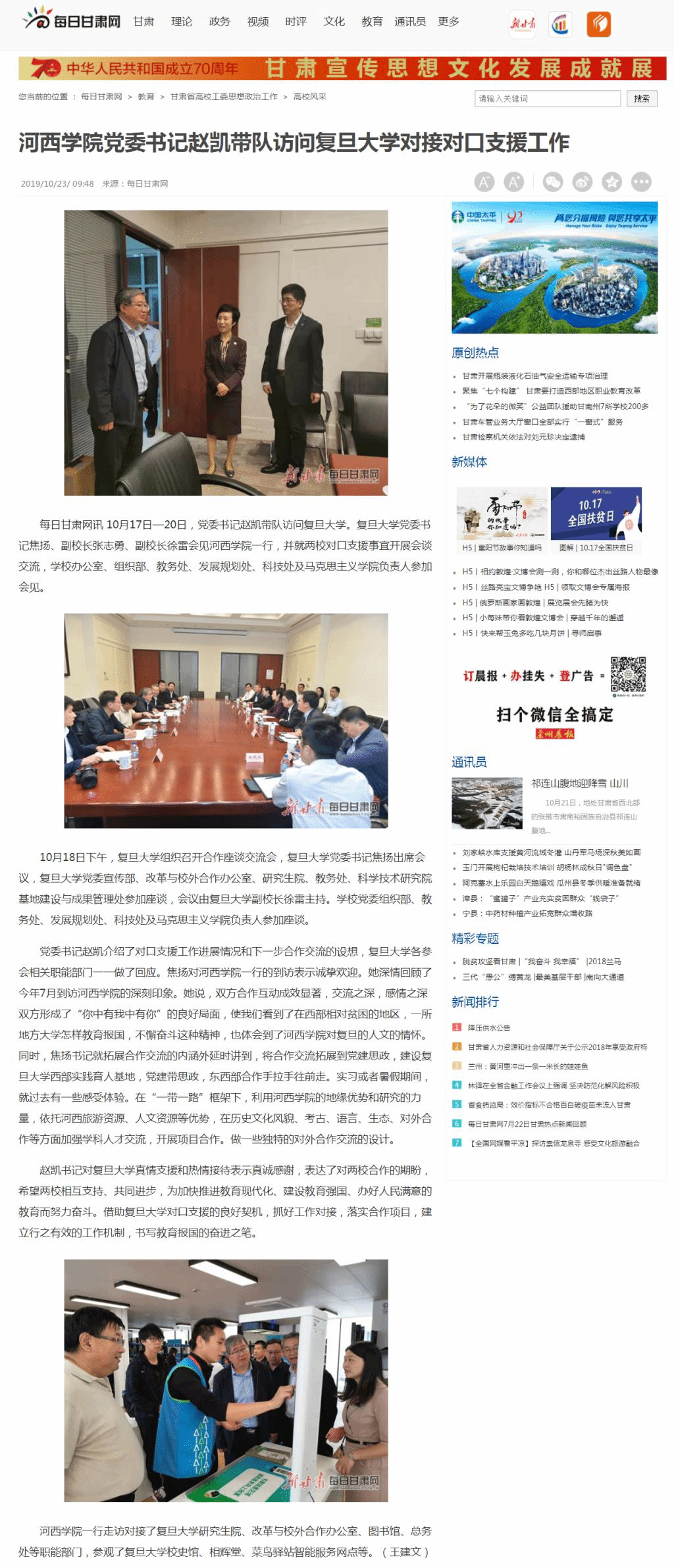 每日甘肃网讯 10月17日—20日,党委书记赵凯带队访问复旦大学。复旦大学党委书记焦扬、副校长张志勇、副校长徐雷会见红足—世足球网一行,并就两校对口支援事宜开展会谈交流,学校办公室、组织部、教务处、发展规划处、科技处及红足—世足球网负责人参加会见。