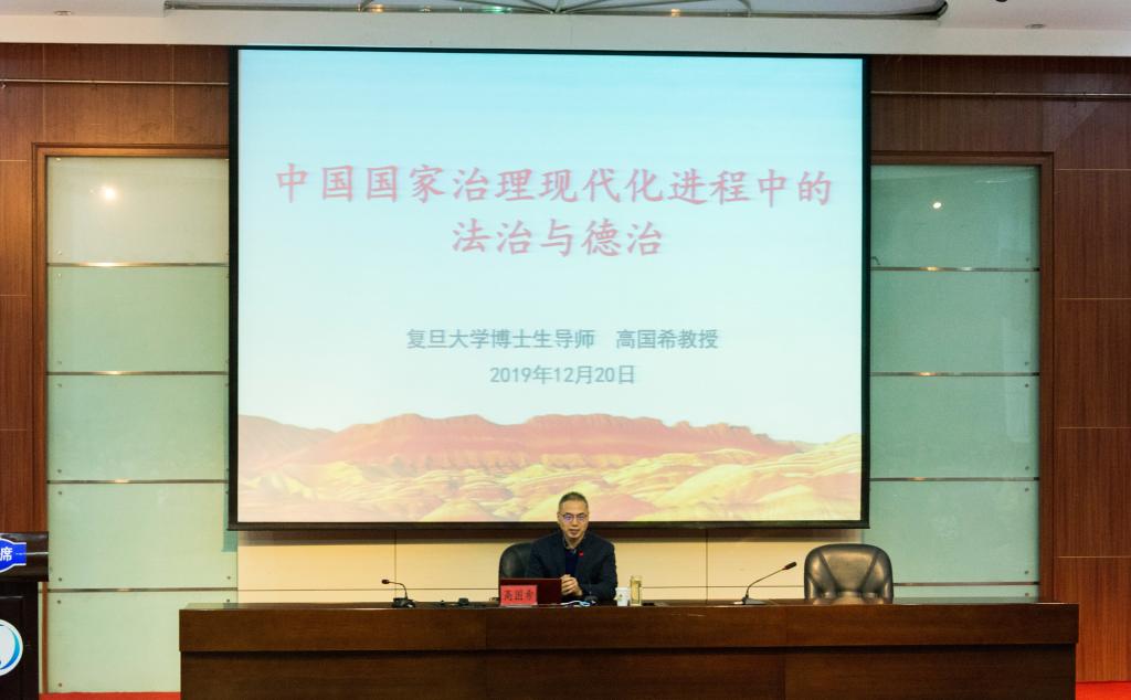 12月20日下午,高国希教授在图书馆报告厅作了题为《中国国家治理现代化进程中的法治与德治》的学术报告。校长张汉燚参加了报告会,学院师生200余人聆听了报告。