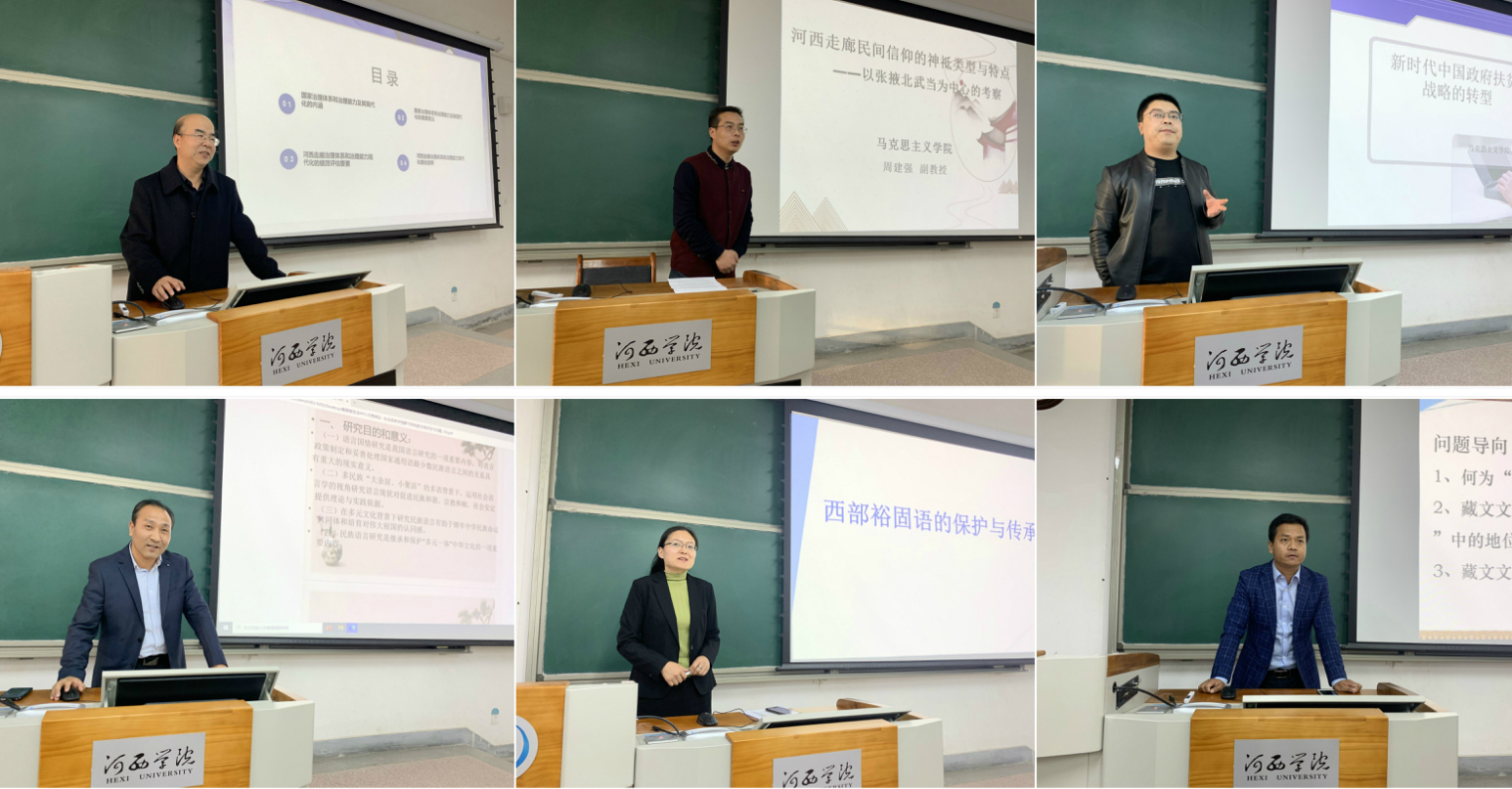 报告会上,宁军、周建强、陶有祥、才昂闹日、郭梅、多杰项智6位老师以个人学术研究专长为出发点,分别作了题为《河西走廊政治治理现代化及其治理机制研究》、《河西走廊民间信仰的神祗类型与特点——以张掖北武当为中心的考察》、《新时代中国政府扶贫战略的转型》、《试论社会语言学视野下的民族交流、交往与交融--以甘肃省夏河县L村为例》、《西部裕固语的保护与传承》和《敦煌藏文文献在敦煌学研究中的地位与价值》的专题报告。报告内容包括国家治理体系、治理能力现代化,脱贫攻坚重大战略,具有浓郁地方特色的民族语言保护传承、文献整理编纂、民族交往交流交融历程等,梳理了本地区在国家大政方针与经济发展、文化繁荣中的重大理论现实问题,为学院师生带来一场思维模式多元化、学科内容丰富化的思想对话,通过常态化的机制搭建了学院师生学习、交流与共享的学术平台。